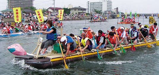 参加者が工夫を凝らし作った自慢の手づくりイカダを見るのも楽しく、レースの合い間にはアトラクションの披露や、順位予想当て投票など、レース以外の催しも行われます。
