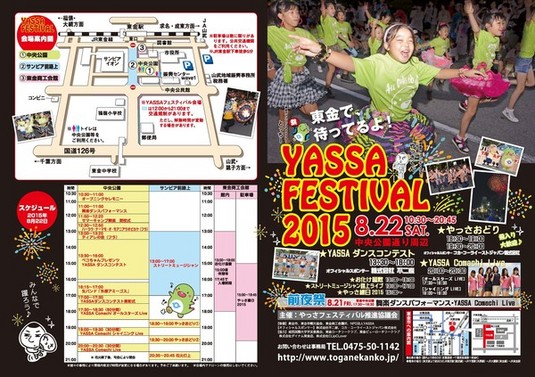 日程:8/22(土)時間:10時30分~場所:東金中央公園周辺料金:無料(有料のイベントあり)問合せ:YASSAフェスティバル実行委員会電話:0475-50-1142
