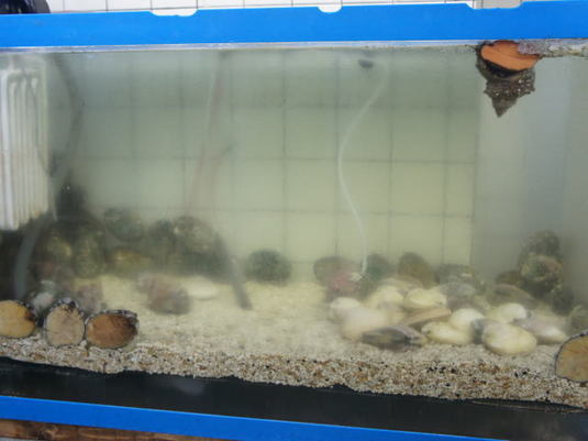 昨日の夜は雨が降っていたり雷が光っていたりと嫌な天気でしたが、今日は見事な晴天になっております!(`・ω・。)写真は当館のハマグリやサザエ達です♪♪水槽の中は冷たくて気持ちよさそうですね(^^)こんなに暑い日は私も水槽に潜りたくなります・・(´_`)