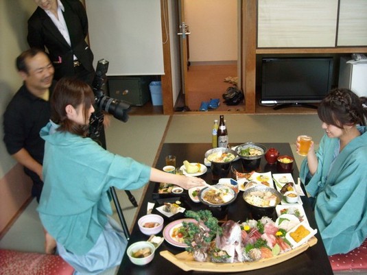 屋上の足湯に浸かってみたり、お部屋での御食事の様子などを写真に撮っていただきました。