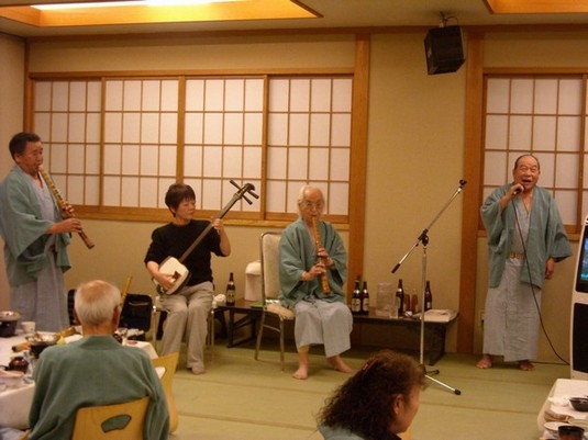 今夜の宴会の様子です♪♪愉快な音色が宴会場から聞こえてきたので宴会場を覗いてみました|д・)浜田会様の皆様が民謡をやっていました☆彡また来月もお越しになって下さるので来月も聞けるのを楽しみにしていますね(o´∀`o)