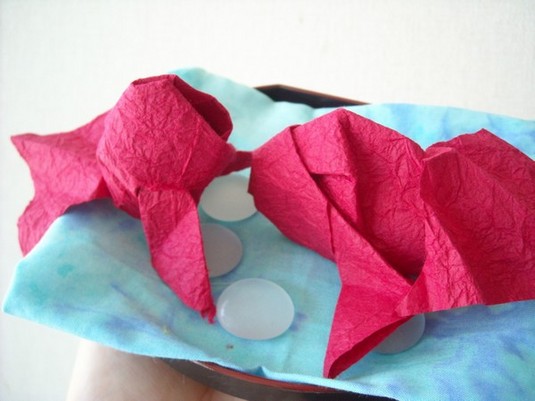 若女将手作りの新しい作品です♪真っ赤な金魚は和紙で作られているんです!ひらひらしているので気持ちよさそうに泳いでいるように見えます(´∀`ノノ"☆