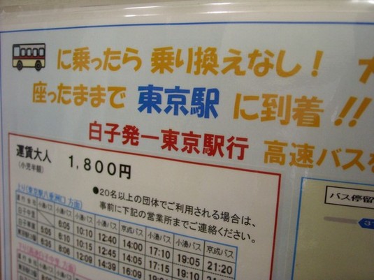 当館駐車場から出ている高速バスの「白子中里」から「東京駅」までのバスの回数券、通常1,800円を当館フロントで購入頂くと200円割引の1,600円でお買い求めいただけます(^Д^)ゞ