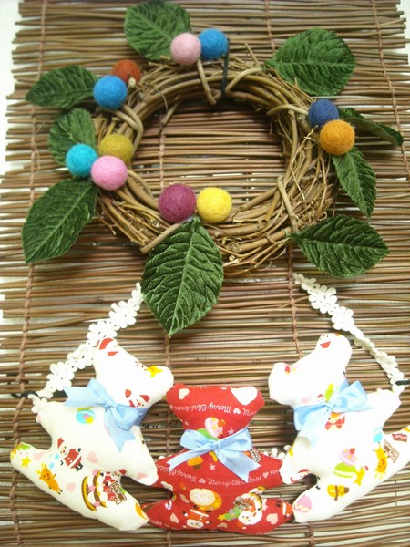 手作りリースです♪3匹のくまさんまで手作りで、サンタさんのイラストの生地で作られています(*゚ェ゚*a)とっても可愛いので、たくさんのお客様に見て頂きたいです(*ノ∀`*)ノ