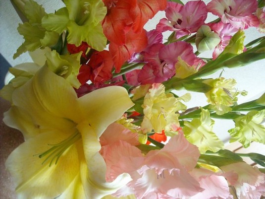 花瓶にぎゅうぎゅうに入ったカラフルなお花達、全部スタッフの自宅でとれたものなんです~\(○^ω^○)/