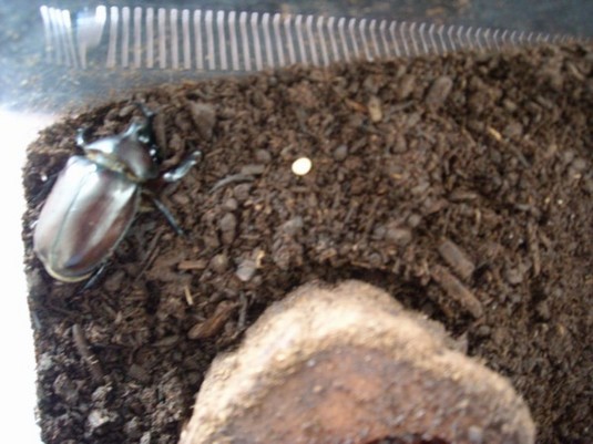 今朝カブトムシに朝ごはんをあげていたら見つけました(^^)!これが噂のカブトムシの卵かな?カブトムシの右側の丸くて白い物体です。
