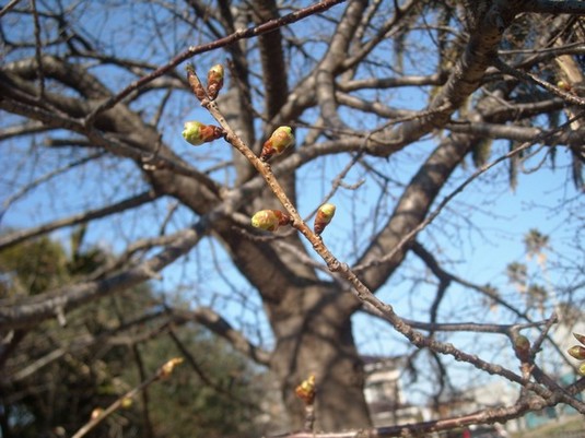 早咲きの「しらこ桜」の開花状況でございます♪緑色の蕾が目立つようになってきました。全体的に見るとまだ0分咲きです(・_・)