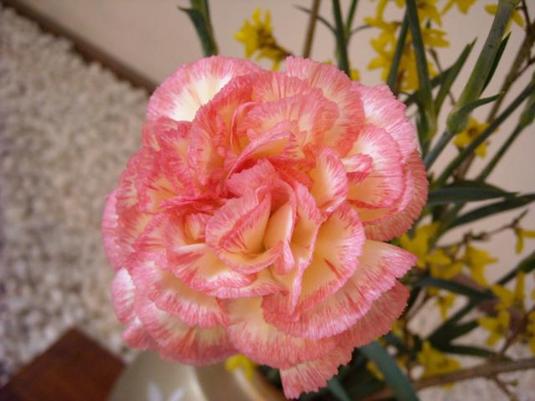ロビーにて可愛いお花を見つけました(´ω`)普通のカーネーションの3倍くらいはある大きさの花を咲かせております!!薄ぴんくと薄きいろの2食の花びらの組み合わせがマカロンみたいでとても可愛いです♪♪