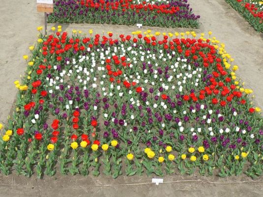 不安定な天候の中、頑張ってくれたチューリップ達。模様植えの状況は…。何とか当社のマークに見えなくもなく、まだ咲き揃っていないという状況も踏まえて、そして、初めてのチャレンジということで、合格とさせていただきます(甘口評価で申し訳ないです)。今日は近場の幼稚園児達がたくさん見学に来ていました。みんな、「うわー、きれい!」「あのチューリップかわいい!」とおおはしゃぎで、見ているこちらも楽しくなりました。