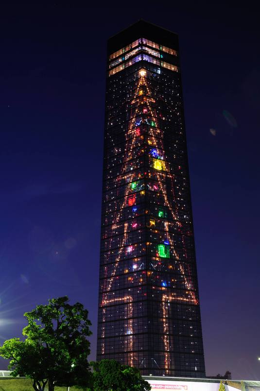 本日23日より千葉ポートタワーの壁面に、巨大なクリスマスツリーが出現致します♪通常のビル、30階分に相当する巨大なツリーにイルミネーションの雪が舞い降ります(^^)!!!