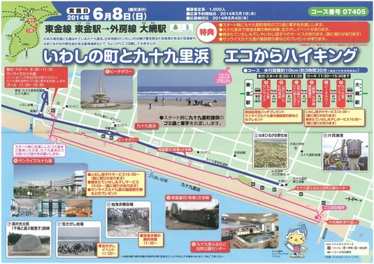 スタート時にゴミ袋と軍手を配布し、約10キロの道のりを砂浜のゴミ拾いをしながら、九十九里町の文化財やふるさと自然公園を巡る、大人も子どもも楽しめるイベントとなっております。