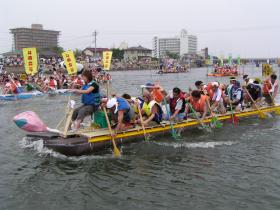 今年で第20回を迎えるこの大会は、平坦な九十九里平野を流れる川の特性を活かし、川を下るのではなく満潮時に海水が川へ逆流する現象を利用して、河口から上流へと川をさかのぼる、全国でもめずらしい川のぼりレースです。