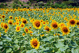 見頃は7月中旬から下旬で、「農村ふれあいセンター」前の1haの畑とJR外房線陸橋下の0.5haの畑に約5万本のヒマワリ(ハイブリットサンフラワー)が咲き乱れます。