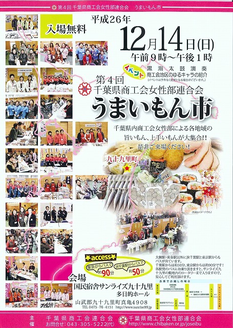 日時:平成26年12月14日(日) 午前9時~午後1時会場:国民宿舎サンライズ九十九里多目的ホール 山武郡九十九里町真亀4908 ℡0475(76)4151お問合せ:千葉県商工会連合会・千葉県商工会女性部連合会電話043(305)5222㈹