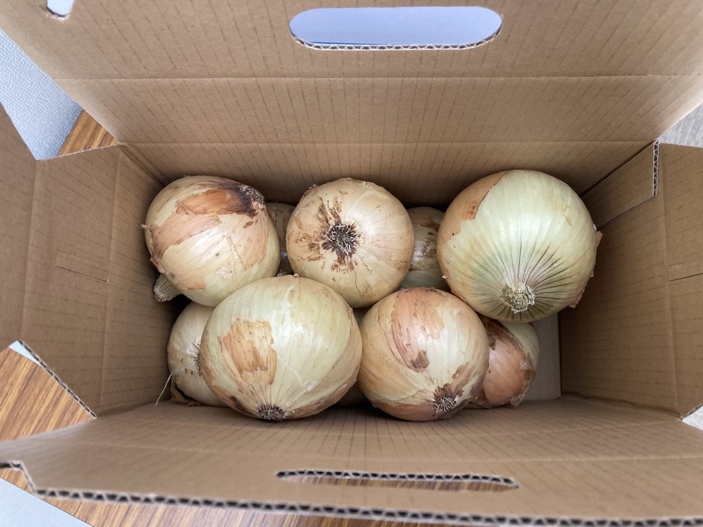 こんにちは!今年も甘くて美味しい新玉ねぎの季節がやって参りました。当館でも1箱4㎏入り¥800おすすめのレシピ付で販売中です!おすすめはたまねぎとバターをレンジで温めて、醤油を垂らして食べるとたまねぎの甘さが引き立ちバターの風味と合わさってとても美味しく頂けます。この機会にぜひ一度ご賞味下さい!